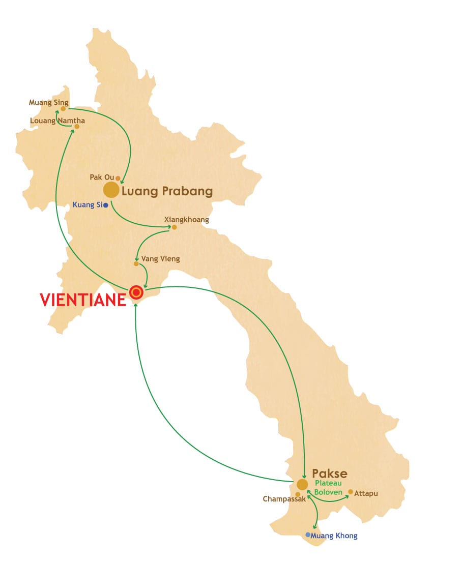 Vientiane - Oudomxay – Luang Namtha – Muang Sing - Pak Ou - Luang Prabang - Xieng Lom – Xieng Khouang – Vang Vieng - Boloven Plateau – Tadlo – Attapeu - Champasak – Khong Island – Ban Somsamai - Departure