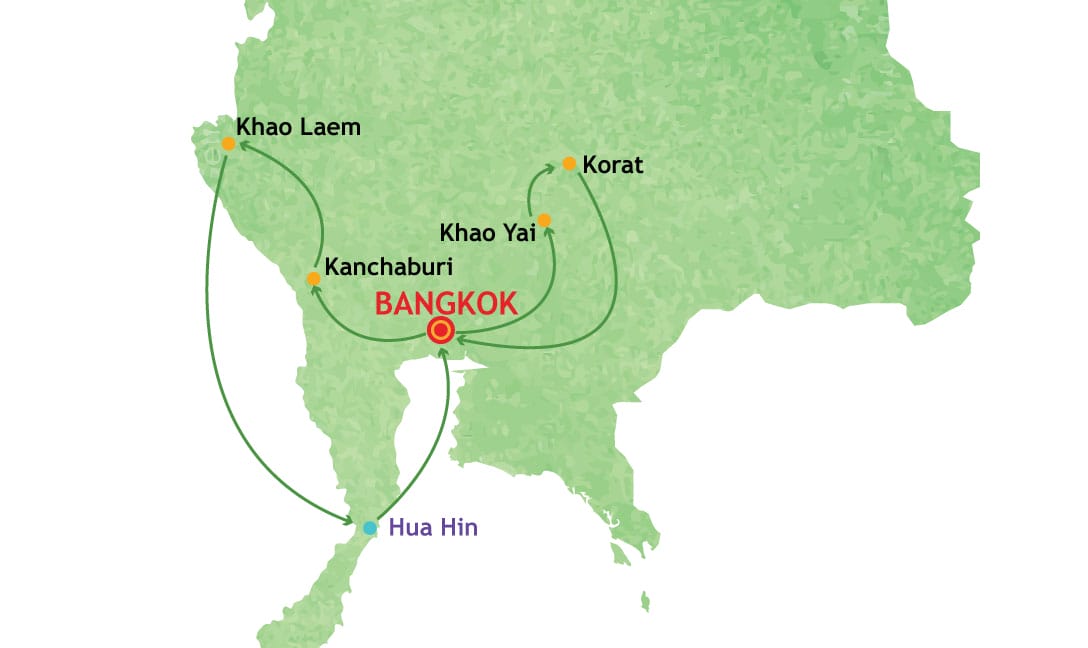 Bangkok - Khao Yai National Park - Korat – Pi Mai Historical - Kanchanaburi - Khao Leam - Lake Cruising - Coconut Island - Khao Leam - Hua Hin - Bangkok - Departure